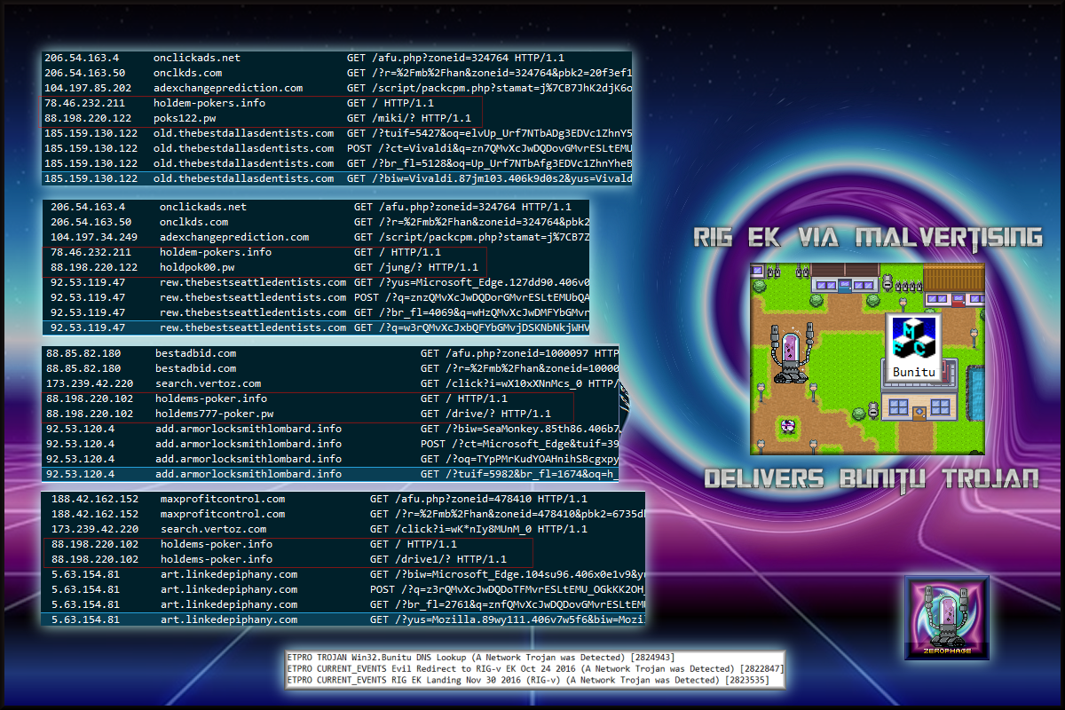 I have been tracking a Rig EK campaign that drops Bunitu. It appears to be cycling domains often. I originally found it via my usual malvertising chain. Every site always has an iframe to another domain usually on the same IP which then leads to Rig EK. I believe the gate requires a correct referrer in order to appear. I’m not sure if this gate exists anywhere else in the wild or whether it is unique to the threat actors behind Bunitu.