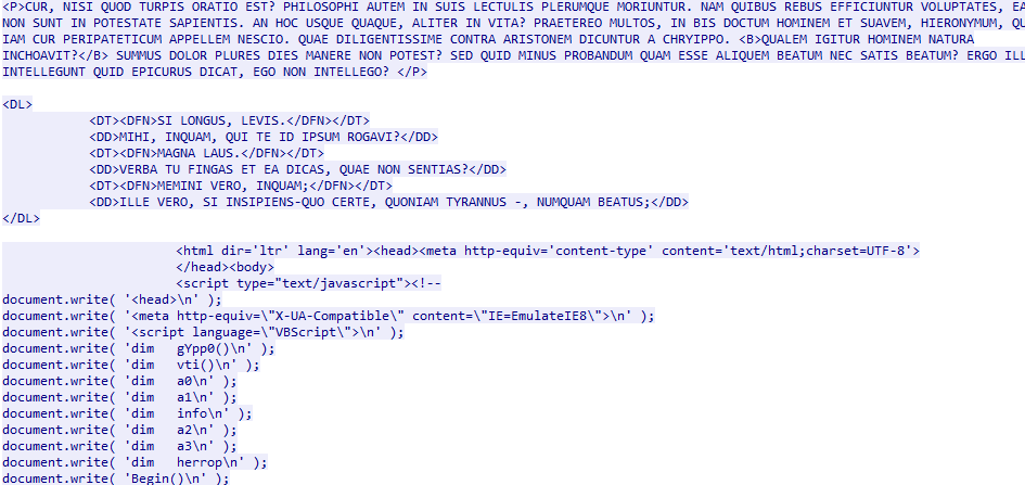 - The malvertising chain let to a website that contained jibberish but also hosted the entire landing page with little to no attempt to obfuscate it. Below is a snippet: