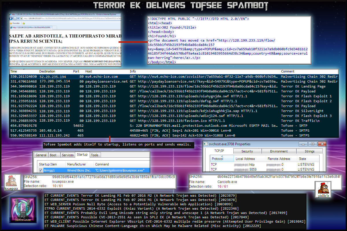 Terror EK via malvertising drops Tofsee spambot. I have added the IP addresses in here manually. The PCAP uses a proxy IP.