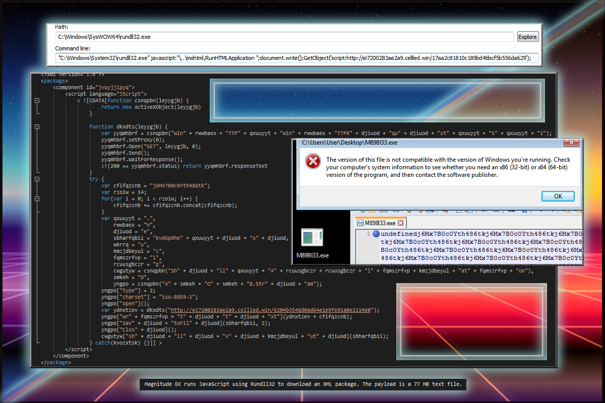 Not entirely sure how yet but possible through the Flash exploit, Magnitude EK was able to call a JavaScript command using Rundll32 which downloaded and ran an XML package which then dropped a payload on the Desktop. This Payload despite having an .exe extention is actually a 77 MB text file seemingly filled with jibberish.