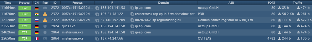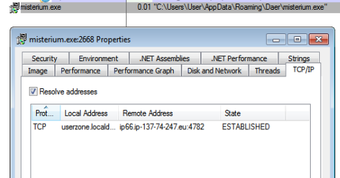 The malware attempted to connect to 137.74.247.66 over port 4782. Below you can see the connection that was established.